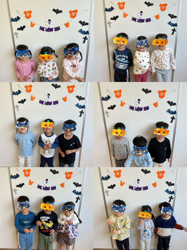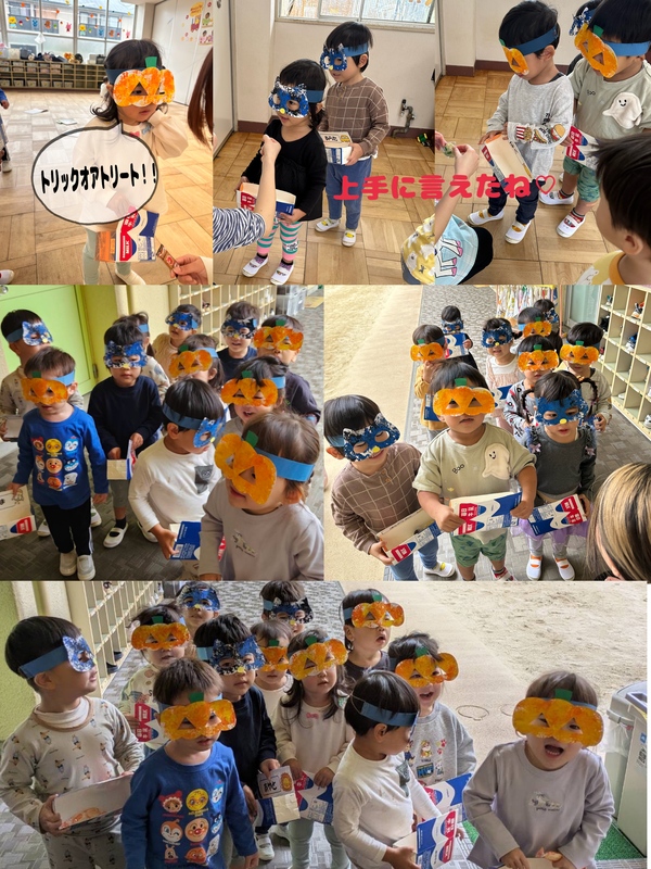 | お菓子をもらうのを楽しみにしていた子ども達! 元気よく "トリックオアトリート" と言い先生にお菓子をもらってました♡ 『お菓子いっぱい!!!』と喜ぶ子ども達、とても可愛かったです☺️ お菓子はおやつの時間に美味しくいただきました! かぼちゃとネコのお面は子ども達が自分で選び制作しました♪ |