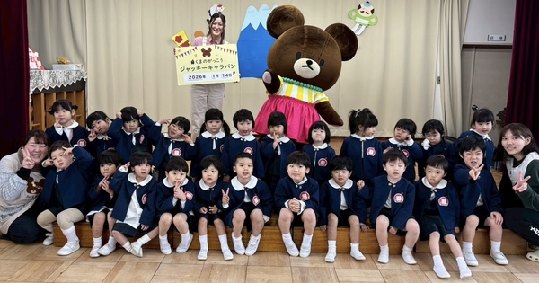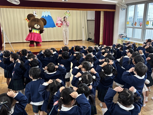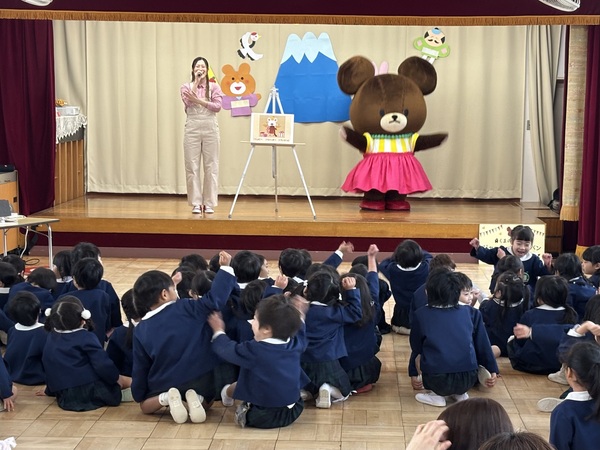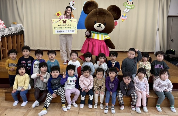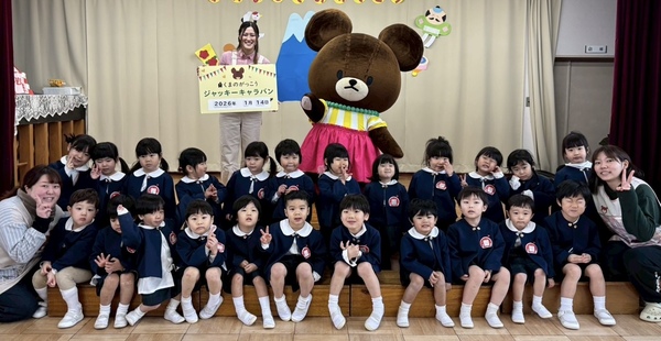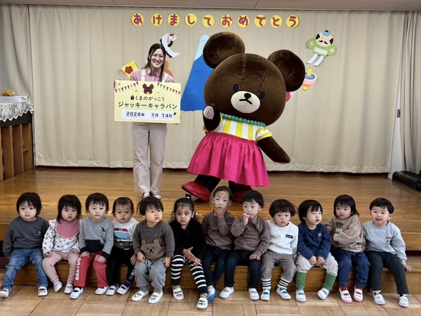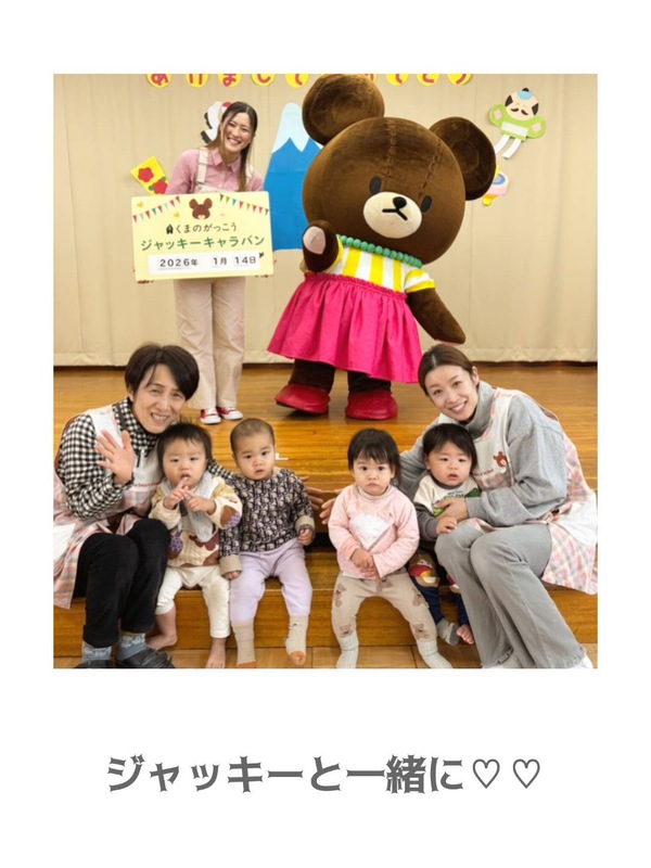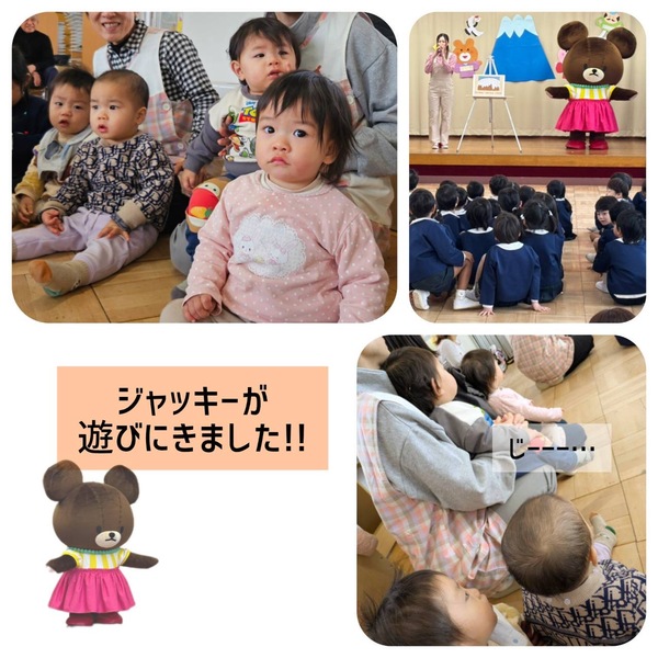 | 今日は、保育園にくまのがっこうの ジャッキーが来園してくれました🐻♡ ジャッキーと絵本を読んだりクイズをしたり 踊った後には、みんなで写真を撮りました!! ふわふわ動いてるジャッキーにあかぐみの みんなは、釘づけでした☺️ またお家でも子どもたちからお話聞いて みてくださいね⭐️ |