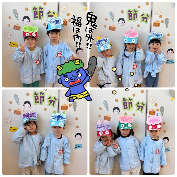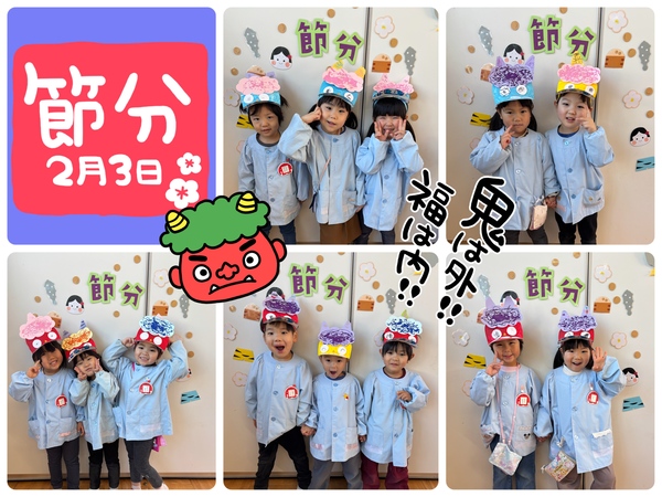 今日は節分!! 鬼が怖いという子どもたちと、昨日から豆まきの練習をしていました。怖い気持ちを抱きながらも、戦う気持ちを整えたみんな😊 鬼が来る前にみんなで豆(新聞紙)を当ててやっつける!『おにはーそとぉー!!』と意気込んでいましたが、鬼がやってくると怖くなってすぐに先生の後ろに🫣