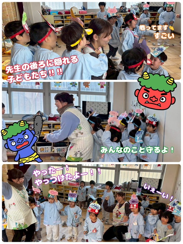 そんな中"負けない気持ち"を持ち、怖い気持ちをグッと堪えて戦う子どももいました。泣いている友だちを守ろうとする子供の姿も見られました!!無事鬼がいなくなると、ホッとして我慢してた気持ちが溢れて涙がポロポロ😢
