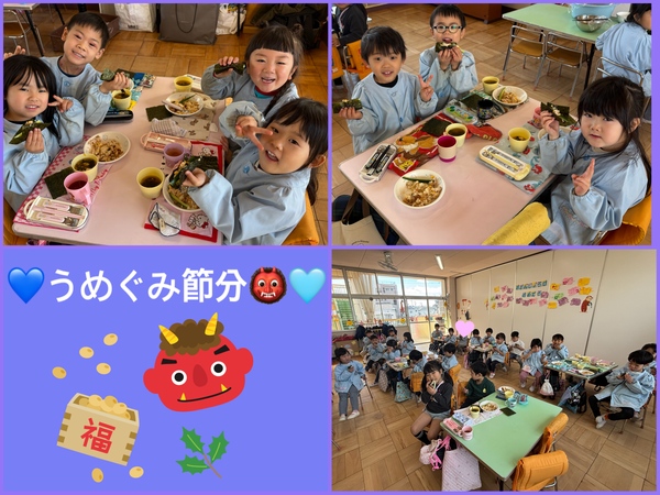 お給食では恵方巻きをつくりました。 食べる前には願い事を心の中で言ってから 食べ始めるんだよー!と伝えたら 目をつぶってお願い事をする子どもたちの姿が 見られました!
